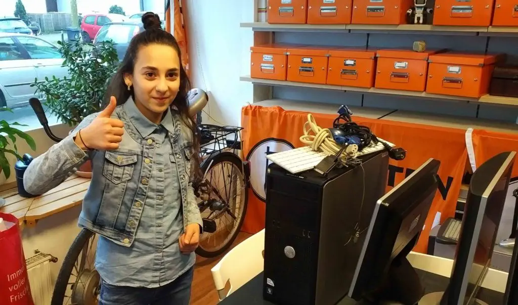 Aktion Hilfe für Kinder hat ein paar ausrangierte Computer gespendet. Joudi freut sich bereits über ihren Rechner.